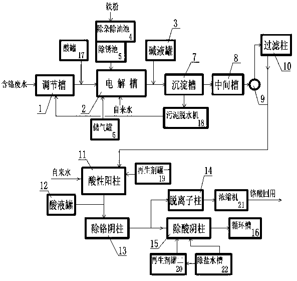 所述離子交換裝置包括依次連通的過濾柱(10)、酸性陽柱(11)、除鉻陰柱(13)、除酸陰柱(15),還包括酸液罐(12),所述酸液罐(12)與除鉻陰柱(13)進口管線連通,還包括脫離子柱(14),所述脫離子柱(14)與除酸陰柱(15)進口管線連通。