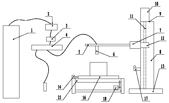 5.根據(jù)權(quán)利要求1所述的一種工業(yè)用水處理藥劑的灌裝裝置的控制裝置,其特征在于:包括控制器,所述控制器連接有行程開關(guān)二(14)、輸送帶驅(qū)動電機(jī)(18)、流量閥(3)、驅(qū)動電機(jī)(10)和泵(2)。