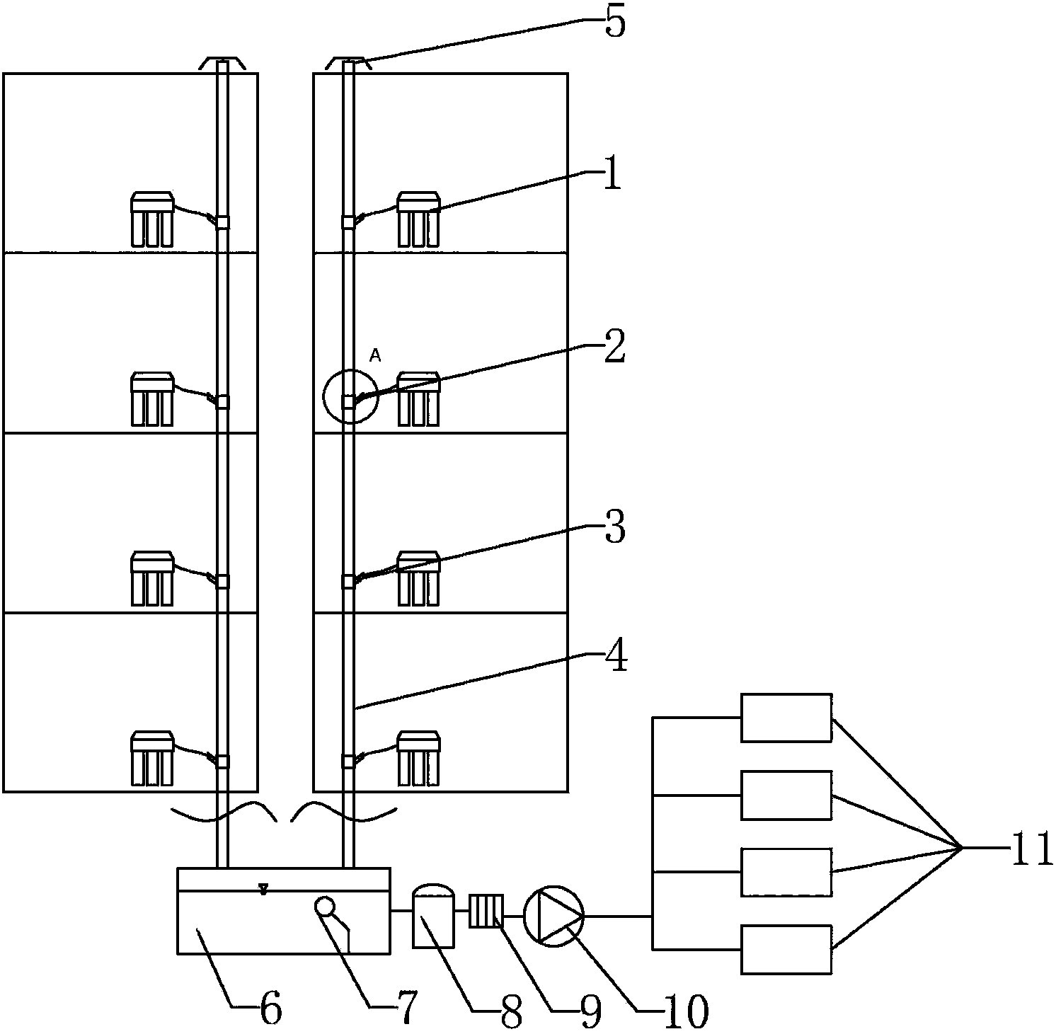 4.根據(jù)權(quán)利要求2或3所述的系統(tǒng),其特征在于,所述回收管路(4)包括沿所述居民樓的高度方向延伸的主管路,以及從該主管路向各居民戶內(nèi)延伸的分支管路,所述廢水接口(3)設(shè)置在所述分支管路的末端,所述主管路的頂端設(shè)有通氣裝置(5)。
