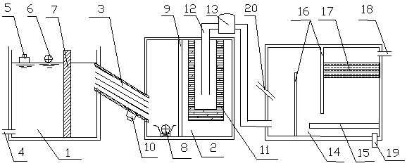 本實用新型的有益效果為:本實用新型提供了多級工業廢水凈化系統,本實用新型技術方案,凈化程度高能夠有效處理多種污水,所述進水口上部設有撈渣器,撈渣器打撈廢水中的懸浮物,所述沉淀池上部設有氣浮機,氣浮機實現油水分離;所述預處理池和沉淀池通過斜管連接,使得廢水中懸浮雜質進行沉淀,泥渣在自身重力的作用下沿斜管滑落至沉淀池底,再集中收集;所述沉淀池底部設有排污泵,排污泵將集中的沉淀物排出,回收利用;所述混凝沉淀池能夠通過向水中投加一些藥劑(通常稱為混凝劑及助凝劑),使水中難以沉淀的顆粒能互相聚合而形成膠體,然后與水體中的雜質結合形成更大的絮凝體。絮凝體具有強大吸附力,不僅能吸附懸浮物,還能吸附部分細菌和溶解性物質。本實用新型可適應不同廢水物質的凈化處理,能夠實現油水分離、污泥的沉淀,以及金屬離子和懸浮雜質的去除,能夠對廢水有效治理,防止廢水污染,并且可24小時連續工作,運行穩定可靠,具有良好的市場推廣價值。