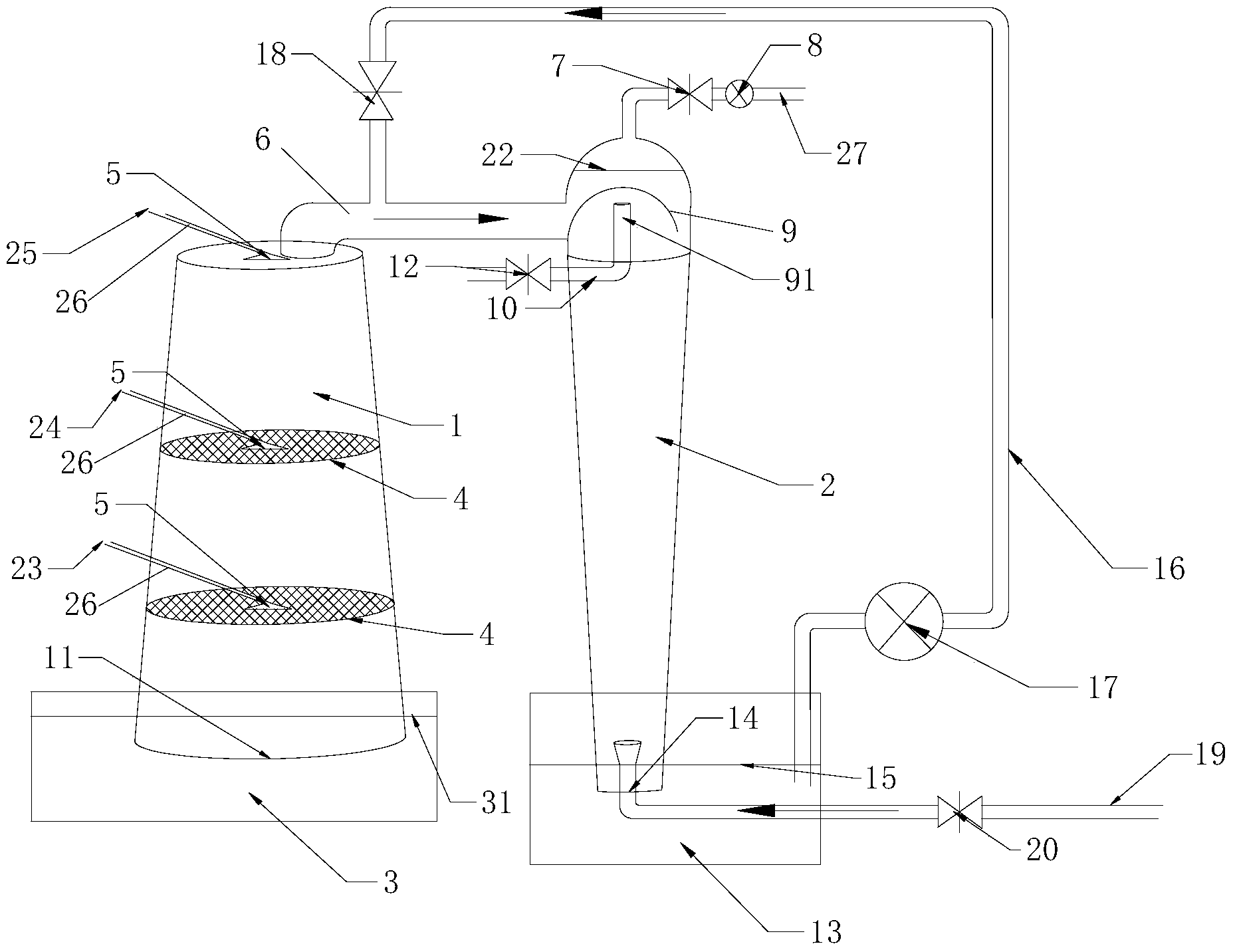3)、裝置關閉:關閉真空泵(8)、關閉第四閥門(20)、開啟第一閥門(18),使外界空 氣從氣體排放口(27)進入,污水處理塔(1)和油水分離塔(2)的液面不斷下降,直到與 第一儲液槽(3)和第二儲液槽(13)的液面平為止,或者關閉第一閥門(18)、第二閥門(7), 第三閥門(12),第四閥門(20),關閉真空泵(8),使第一液面(31)、第二液面(15)的水 位保持同一平面,整個裝置處于密封狀態,如下次開啟時,只需將第一液面(31)的水位高 于第二液面(15)的水位,并開啟真空泵(8)、第二閥門(7),即可使裝置運轉。