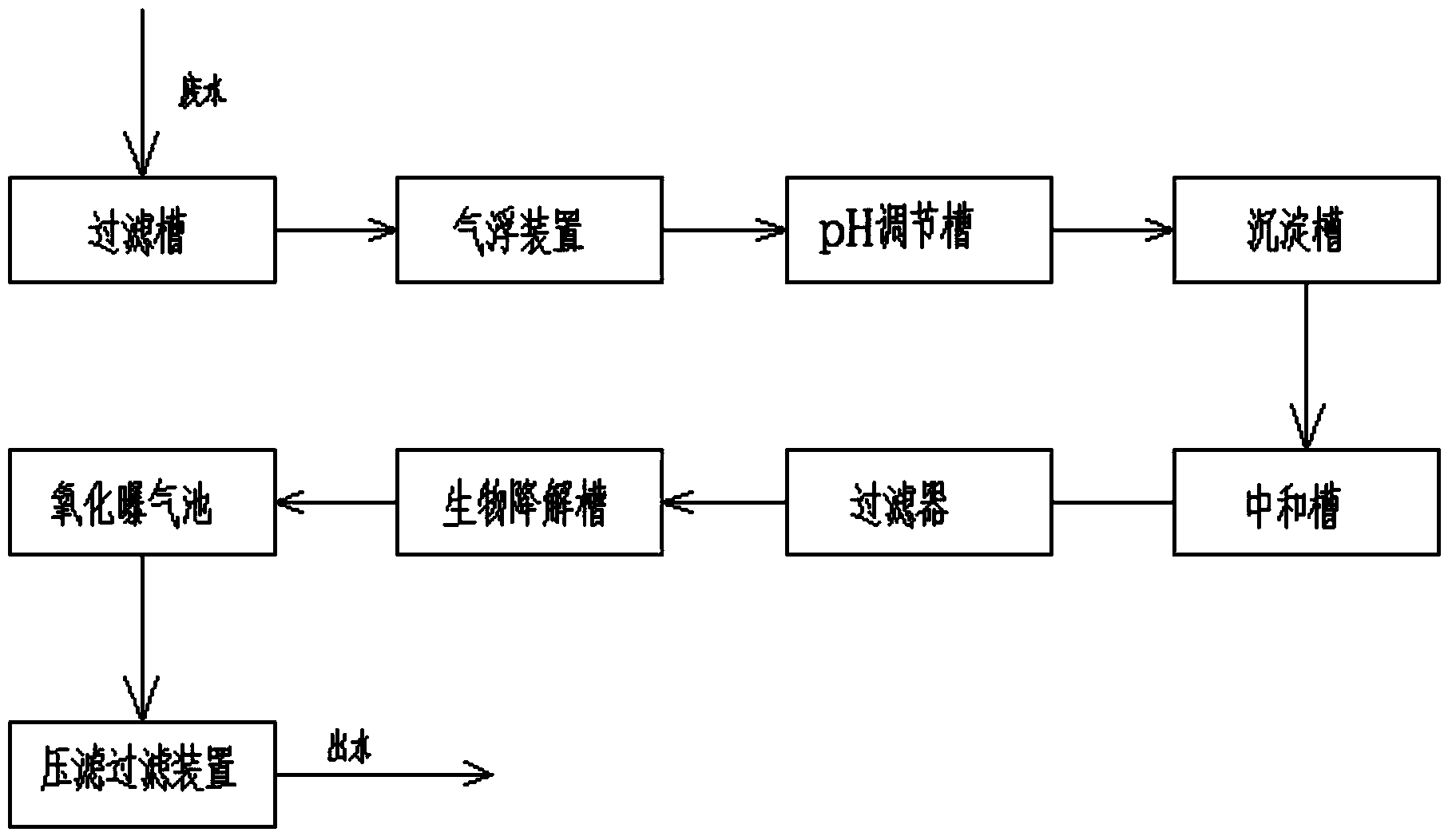 1.一種工業廢水的微生物降解水處理系統,其特征在于,沿著廢水的流 向,包括依次串聯的過濾槽、氣浮裝置、pH調節槽、沉淀槽、中和槽、搭 載有離子交換樹脂的過濾器、生物降解槽、曝氣池及壓濾過濾裝置。