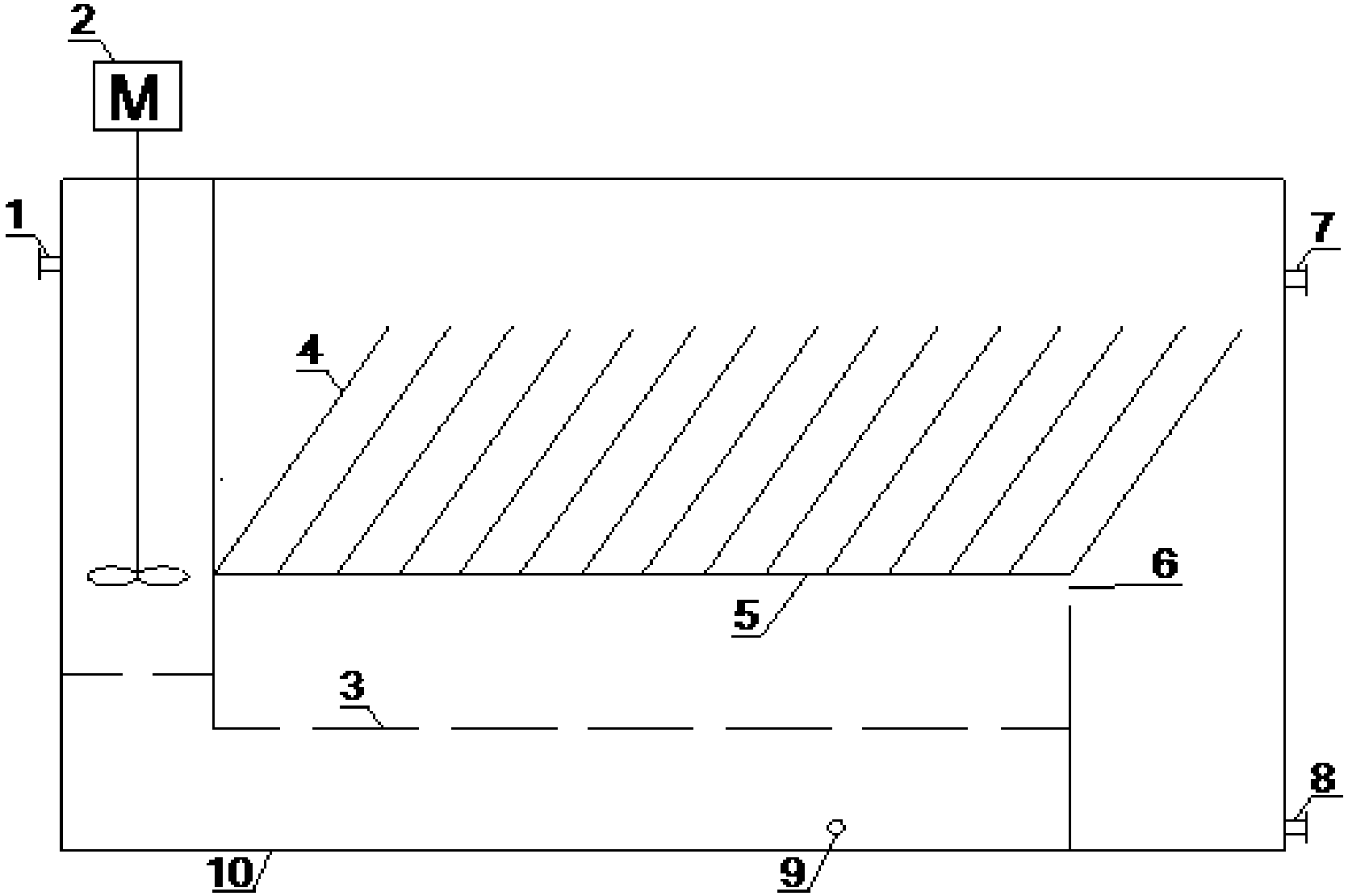 本裝置所述箱體從進(jìn)水口到出水口依次設(shè)有攪拌區(qū)、沉降區(qū)和污泥室,所述箱體的進(jìn)水口設(shè)置在攪拌區(qū)的上方,攪拌區(qū)內(nèi)設(shè)有攪拌裝置的攪拌部件,所述沉降區(qū)通過水平設(shè)置的多孔隔板和支撐板分隔為上區(qū)、中區(qū)和下區(qū),所述上區(qū)、中區(qū)和下區(qū)垂直排列,所述上區(qū)內(nèi)排列有斜板或斜管作為沉降加速裝置,所述斜板或斜管固定在支撐板上方,所述攪拌區(qū)的出口與沉降區(qū)的下區(qū)入口連接,所述沉降區(qū)的中區(qū)通過溢流口與污泥室連通,所述沉降區(qū)的上區(qū)與污泥室連通,所述箱體在污泥室的上方的側(cè)壁上設(shè)有箱體的出水口,所述箱體在污泥室的底部的側(cè)壁上設(shè)有污泥室排泥口。本實(shí)用新型結(jié)構(gòu)緊湊,提高水中懸浮物的沉降性能、降低出水中懸浮物。