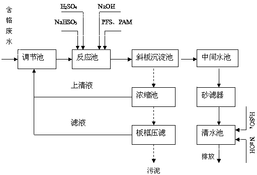 為解決上述技術問題,本實用新型采用的技術方案是:一種小型電鍍廠廢水處理系統,其特征在于:包括調節池、反應池、斜板沉淀池、中間水池、濃縮池和清水池,所述調節池、反應池、斜板沉淀池、中間水池依次相連,所述斜板沉淀池輸出端還與濃縮池連接,所述中間水池通過砂濾器與清水池連接,所述濃縮池還與板框壓濾模塊連接,所述濃縮池、板框壓濾模塊與調節池連接。