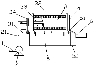 5.根據權利要求1所述的水刺工藝廢水過濾裝置,其特征在于,所述過濾滾筒下方設置有一個回水池,所述回水池上設置有支撐過濾滾筒旋轉的滾輪,所述回水池底部連接設置有排水管道。