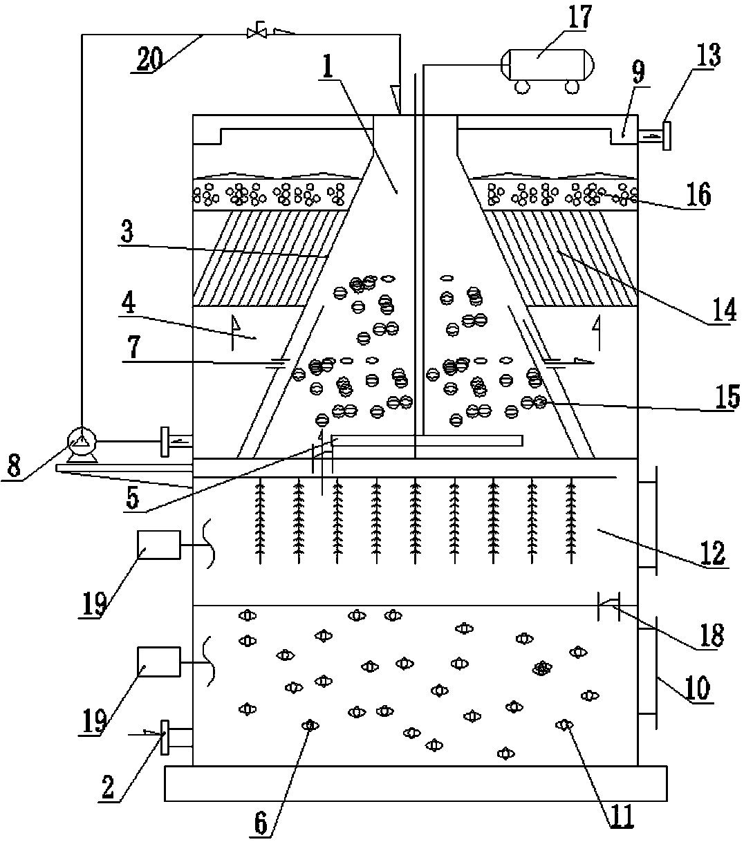 同時本發(fā)明流化床生化區(qū)的結(jié)構(gòu)設(shè)計,能夠最大限度的提高濾料層的面積,同時在流化床生化區(qū)的下部形成較大的懸浮生物反應(yīng)空間,進(jìn)一步提高污水處理的效果,提高本發(fā)明的實(shí)用性。