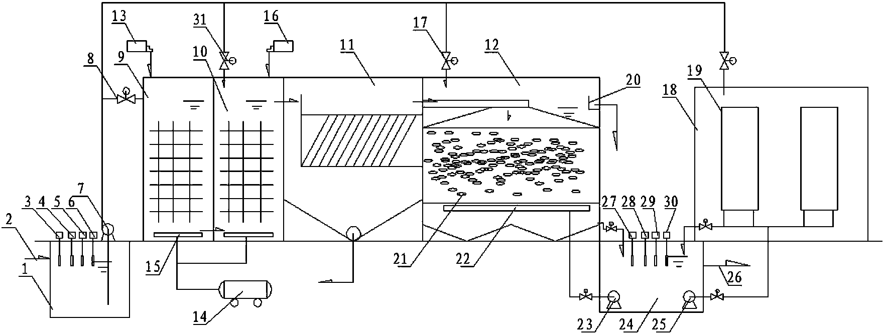 所述清水池配設有出水檢測儀、出水濁度檢測儀、出水氨氮檢測儀和出水總磷檢測儀。