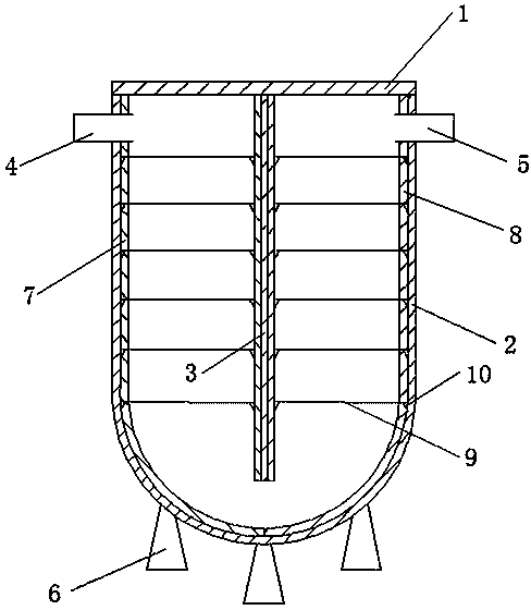 1.一種綠色高效鍋爐給水處理系統,其特征在于:該系統包括過濾裝 置和阻垢除垢器,所述阻垢除垢器包括蓋體(1)、桶體(2)、插板(3)、 進水口(4)、出水口(5)、底座支架(6)、納米防垢金屬陶瓷層(7)、活 化延時納米陶瓷層(8)、孔板(9)、孔板支架(10);所述桶體(2)上設 有蓋體(1),桶體(2)下設有若干個底座支架(6);所述桶體(2)上部 的左側設有進水口(4)連接過濾裝置,右側設有出水口(5);所述插板(3) 設置在桶體(2)中間,將桶體(2)內部分隔成左右兩個腔室,插板(3) 距桶體(2)最底部有空隙;所述孔板支架(10)有若干個,分別設置在插 板(3)左右側壁及桶體(2)的左右側壁上;所述孔板(9)設置在孔板支 架(10)上,孔板(9)上有若干個孔洞;所述左腔室的桶體(2)側壁、 插板(3)左側壁、孔板(9)上下面及孔壁均設有納米防垢金屬陶瓷層(7); 所述右腔室的桶體(2)側壁、插板(3)右側壁、孔板(9)上下面及孔壁 均設有活化延時納米陶瓷層(8)。