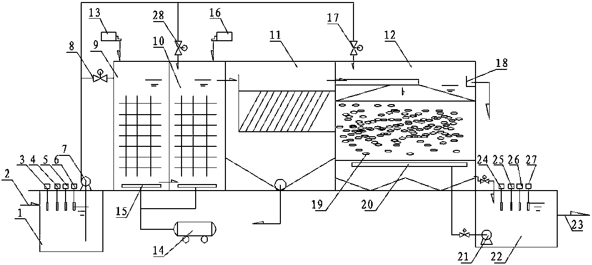 所述生物填料池的底部設置有反沖洗管,所述反沖洗管連通有濾池反沖洗泵,所述濾池反沖洗泵與清水池連通。