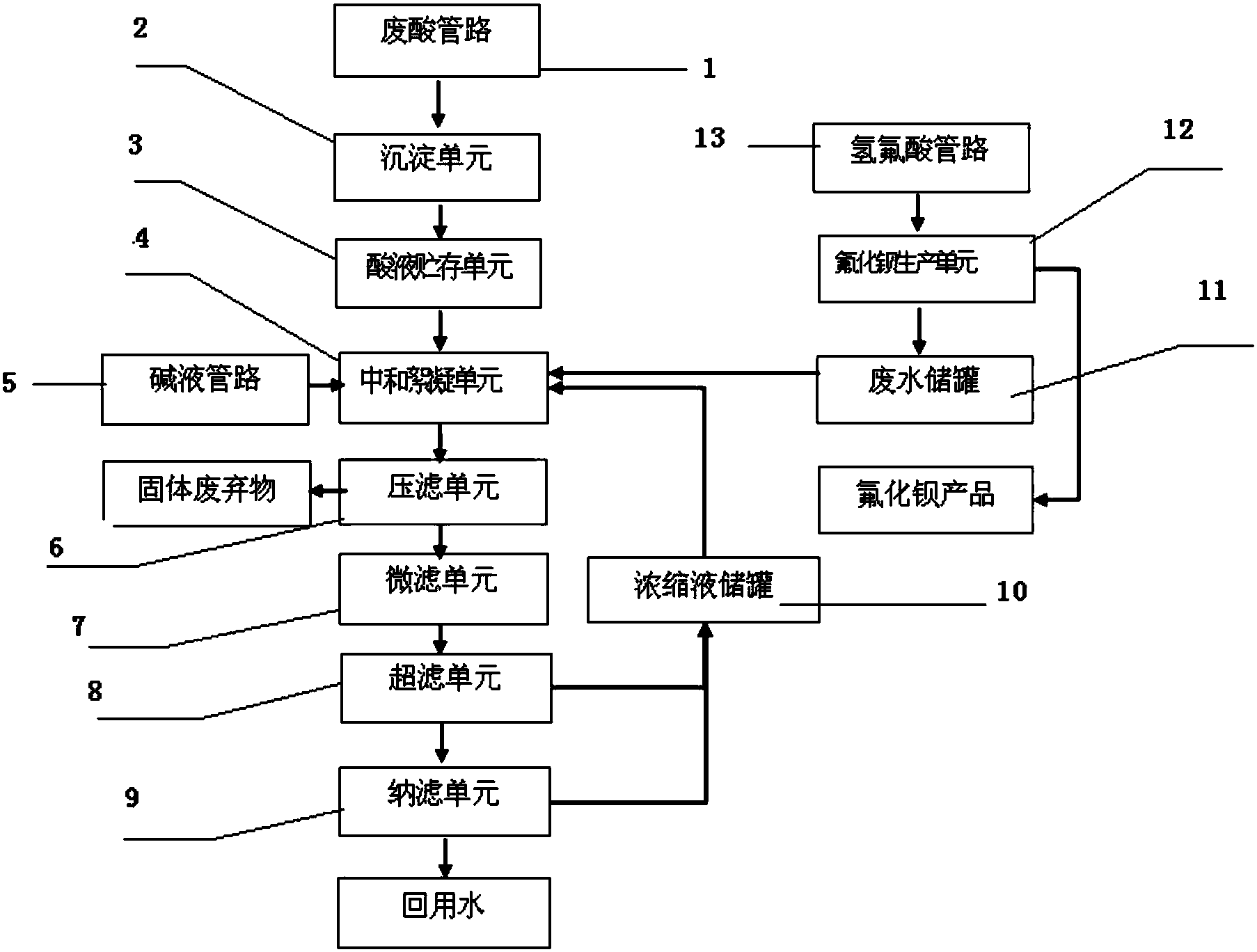 沉淀單元、酸液貯存單元、中和絮凝單元、壓濾單元、微濾單元、超濾單元、納濾單元依次相連通;堿液管路與中和絮凝單元相連通;氫氟酸管路、氟化鋇生產單元、廢水儲罐依次相連通;濃縮液儲罐與超濾單元、納濾單元、中和絮凝單元相連通。