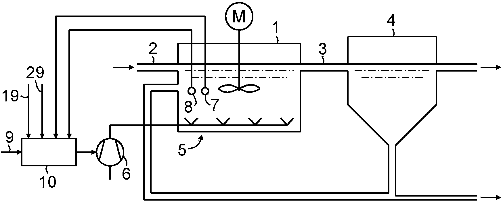 也已知的是:通過測量活化池中溶解的氧的濃度并且經(jīng)由PID調節(jié)器確保例如1至2mg/l的盡可能恒定的氧濃度的方式,在硝化階段期間調節(jié)通風的功率。如果由一個鼓風機供應多個池子(US2014/0263041Al),那么或者經(jīng)由鼓風機轉速或者氣門的位置來進行調節(jié)干預。