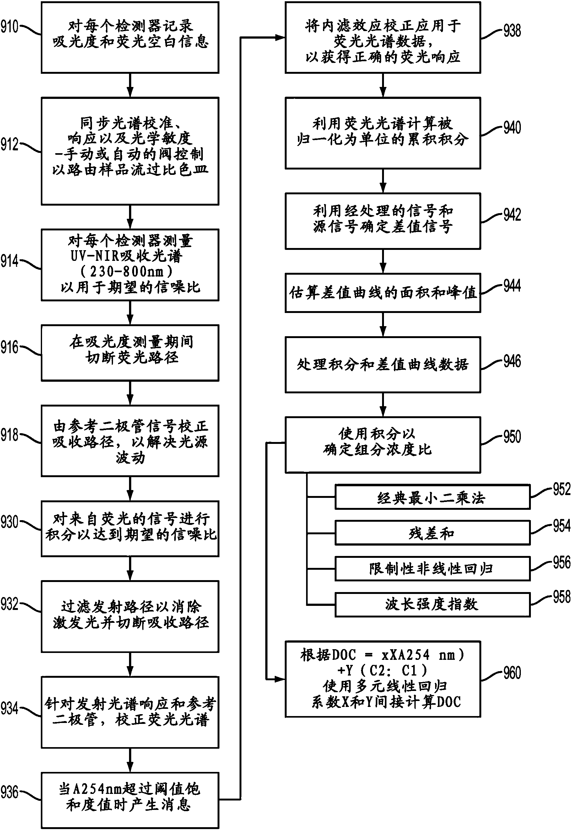 使用具有一個或多個多通道檢測器的儀器,相對于許多離線分析策略而言,吸收數據和熒光數據的收集和處理是即時性生效的(在幾秒鐘內)。基于所公開的代表性實施例,可以容易地校準和驗證算法以精確和準確地量化通過凝結,臭氧或其它過程而具體地去除的化合物。