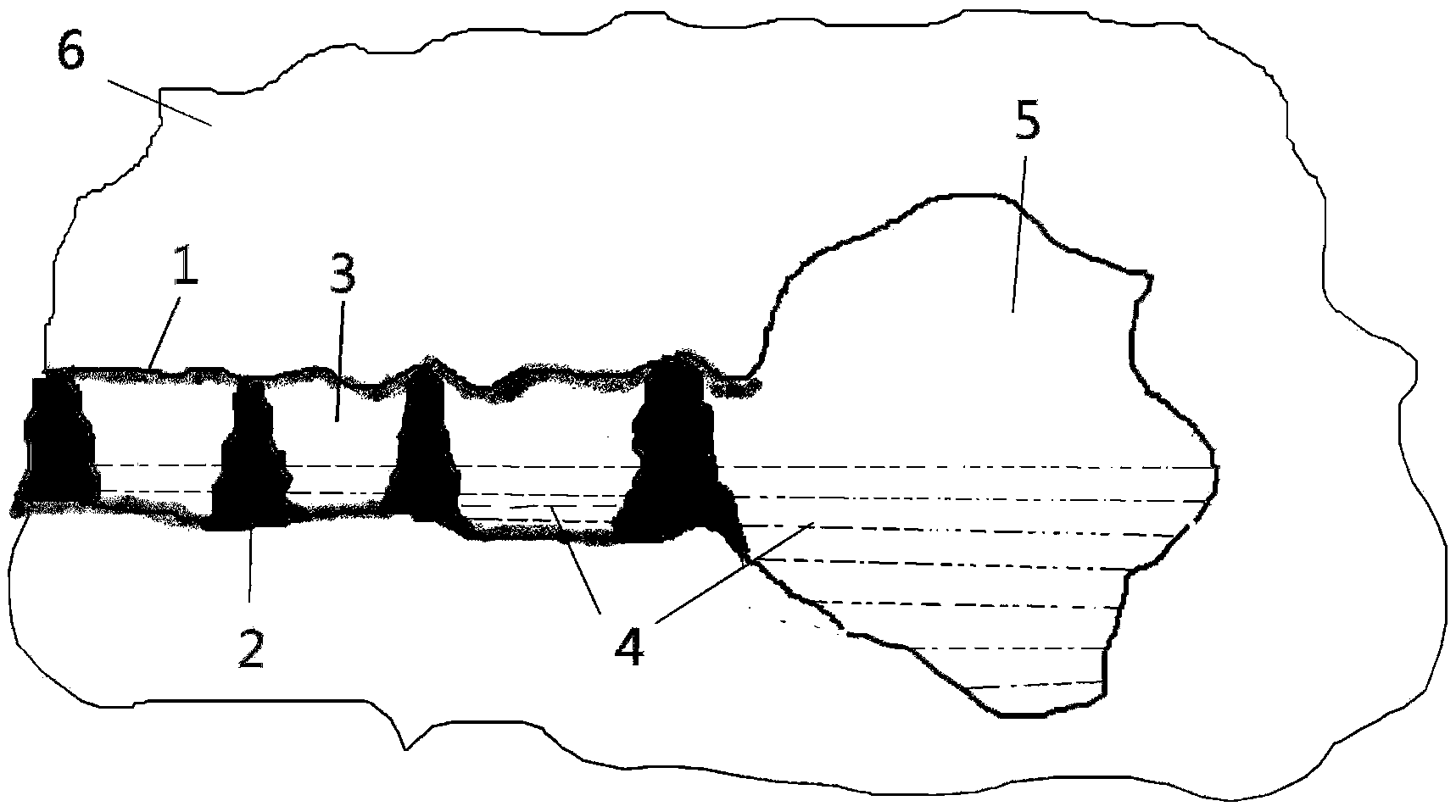 本發(fā)明的有益效果是:本發(fā)明以礦山固體廢棄物和膠凝劑為原材料采用間隔方式沿廢棄礦井修建密閉隔離固化體,對(duì)廢棄礦井進(jìn)行間隔栓塞密閉封堵,使廢棄礦井處于缺氧狀態(tài),解決廢棄礦井暴露于空氣、在氧化環(huán)境條件下硫化物氧化生成酸性物質(zhì)、酸性物質(zhì)溶出重金屬污染物從而導(dǎo)致的重金屬污染問(wèn)題;并且本發(fā)明提供的間隔充填方式,在發(fā)生透水情況下,僅單個(gè)隔室內(nèi)積水透入下層服役礦井,透水量小,從而避免下層服役礦井內(nèi)人員死亡與財(cái)產(chǎn)損失事故,可有效解決廢棄礦井積水易造下層服役礦井透水事故的問(wèn)題;本發(fā)明采用礦區(qū)堆存的固體廢棄物為原材料,解決了礦區(qū)固體廢棄物污染問(wèn)題,而且固體廢棄物價(jià)格低廉,尤其采用間隔方式回填,因回填量小,成本低廉。