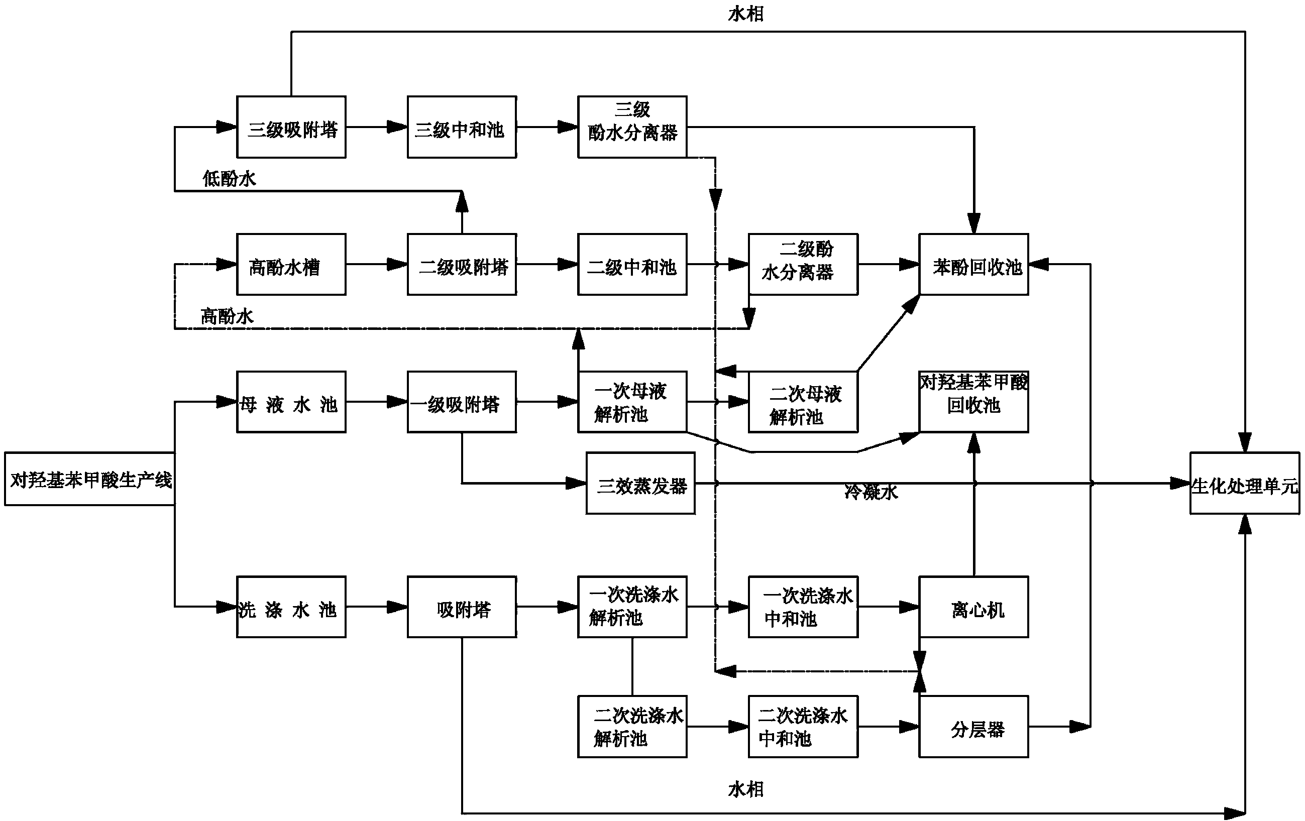 所述洗滌水處理單元包括吸附塔、由所述吸附塔分為兩路,一路通過管道直接與生化處理單元相連;另一路包括依次連接的一次洗滌水解析池、一次洗滌水中和池、離心機、對羥基苯甲酸回收池相連,所述一次洗滌水解析池還通過支路依次連接二次洗滌水解析池、二次洗滌水中和池、分層器、苯酚回收池。