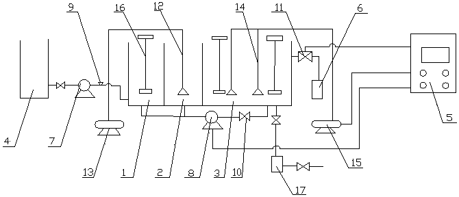 一種高效生物膜法處理高含鹽廢水試驗系統。隨著我國眾工業的迅速發展,排入環境中的高含鹽廢水的量也越來越多,這類廢水的鹽度較高,其中的無機鹽會對普通活性污泥產生嚴重的抑制作用。一種高效生物膜法處理高含鹽廢水試驗系統,其組成包括:進水箱(4),進水箱通過管路與進水泵(7)連接,進水泵通過管路與缺氧池(1)連接,缺氧池池壁與DAT池(2)池壁連接,?DAT池池壁與IAT池(3)池壁連接,缺氧池、DAT池和IAT池分別與污泥回流泵(8)連接,污泥回流泵與PLC控制箱(5)連接,IAT池通過管路分別與排水池(6)、污泥池(17)連接。本實用新型應用于處理高含鹽廢水裝置。