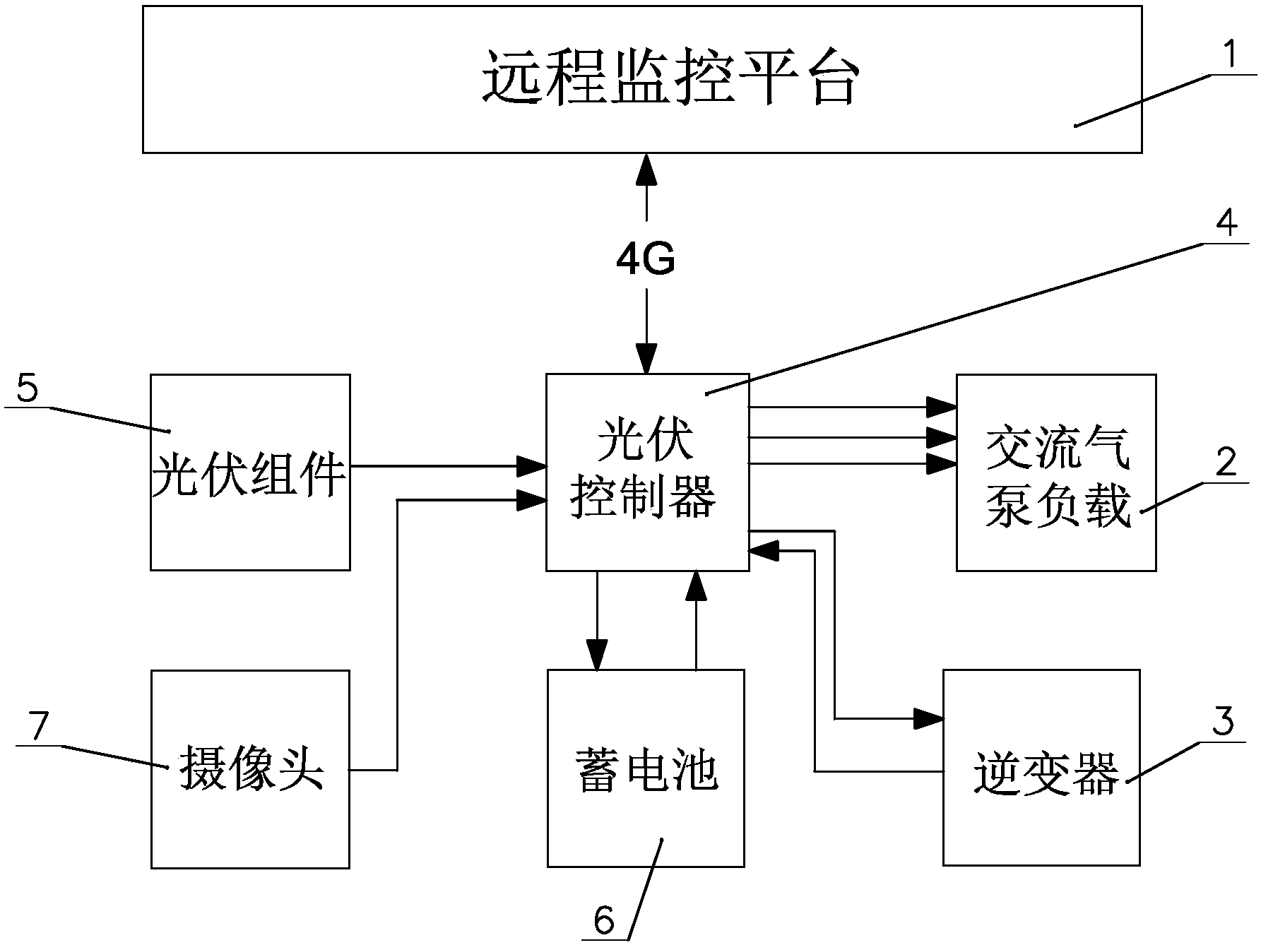 為了實現上述目的,本實用新型提供了一種視頻監控污水處理的光伏控制系統,其特征 在于,包括攝像頭、光伏組件、蓄電池、光伏控制器、逆變器、交流氣泵負載和遠程監控平 臺,光伏組件、蓄電池和逆變器均與光伏控制器連接,光伏控制器輸出端連接有交流氣泵負 載,光伏組件將太陽能轉化為電能,電能通過光伏控制器儲存在蓄電池內,逆變器通過光伏 控制器將蓄電池內的電量由直流電轉化為交流電,輸出給交流氣泵負載使用,光伏控制器具 有4G網絡,通過4G網絡與遠程監控平臺連接,攝像頭與光伏控制器相連。