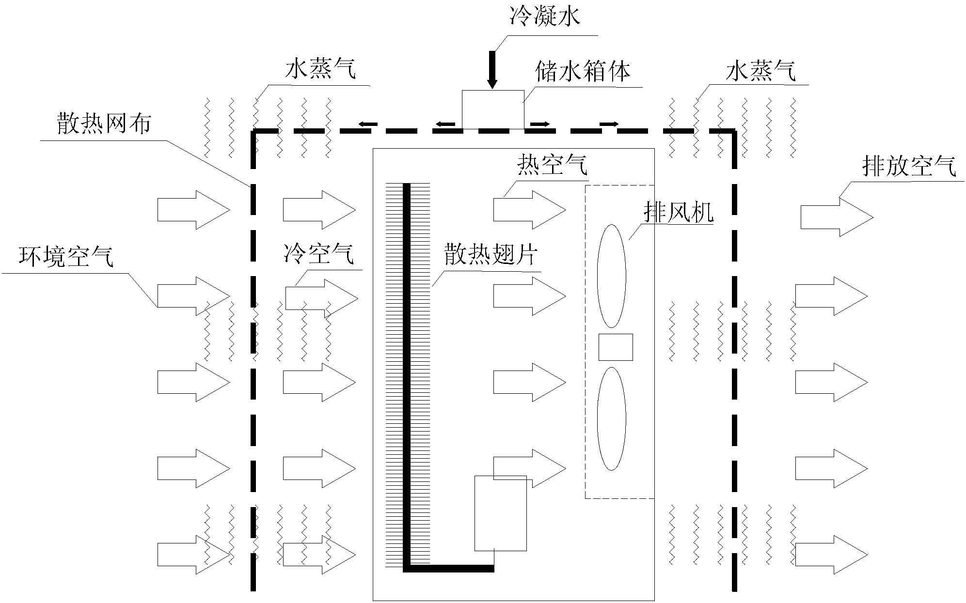 四、排風機將完成熱交換后的熱空氣排出,熱空氣穿過固定在外部的冷凝 水擴散蒸發單元,使蒸發面積擴大后的低溫冷凝水蒸發,蒸發的過程中再次帶 走大量的熱量,使穿過冷凝水擴散蒸發單元的熱空氣降溫,再排入外界環境中, 降低熱污染。