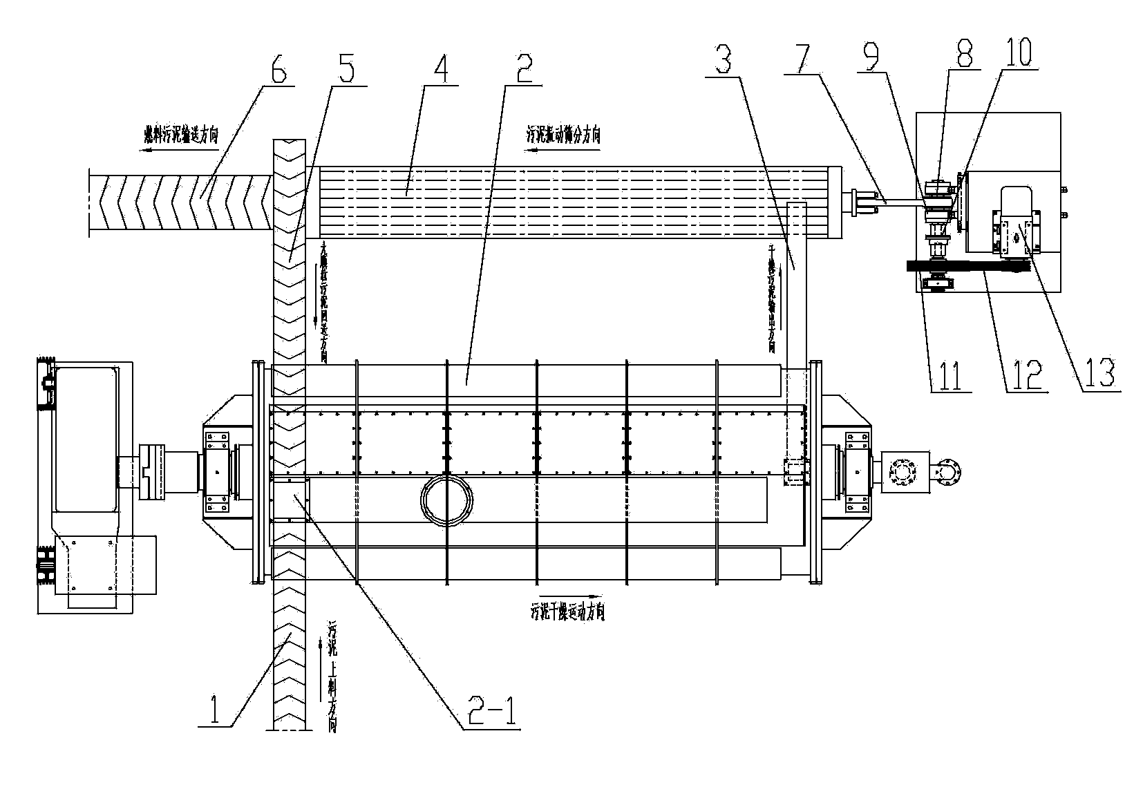 所述污泥干燥機的進料口設置于所述污泥干燥機一側上端,所述污泥干燥機的出料口設置于所述污泥干燥機另一側下端;