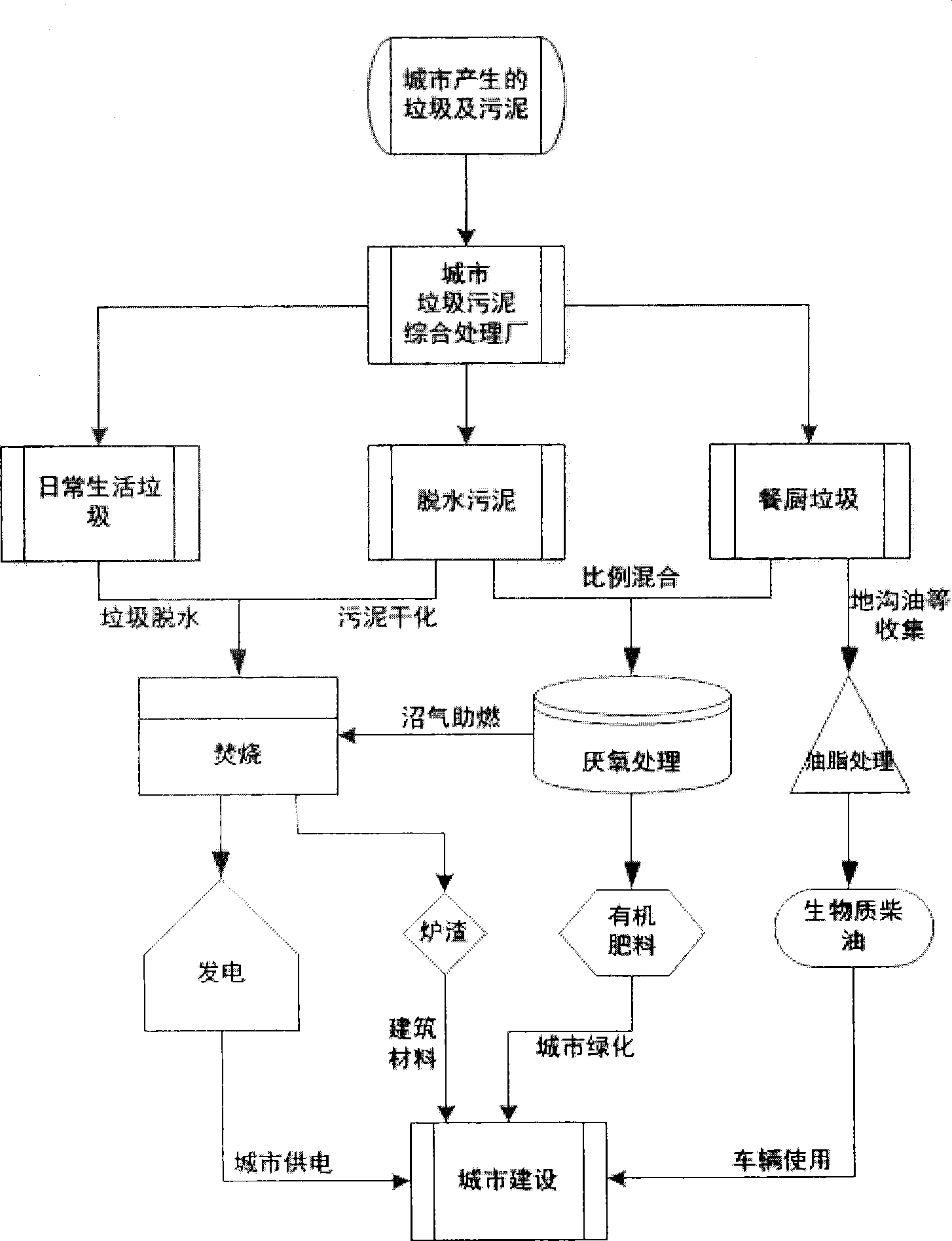 S3,將步驟二分好類的垃圾,其中餐廚垃圾中的地溝油等收集垃 圾一部分經(jīng)過油脂處理作為生物質(zhì)柴油供給車輛和城市建設(shè)機械使 用;另部分油脂通過與脫水的污泥按照1∶2混合后厭氧處理后產(chǎn)生的 有機肥料作為城市綠化使用;另部分的脫水污泥經(jīng)過污泥干化與脫水 后的日常生活垃圾作為發(fā)電廠焚燒燃料使用,進而生產(chǎn)的電能為城市 人們生活生產(chǎn)使用;此外焚燒爐渣作為城市建設(shè)的建筑材料使用。