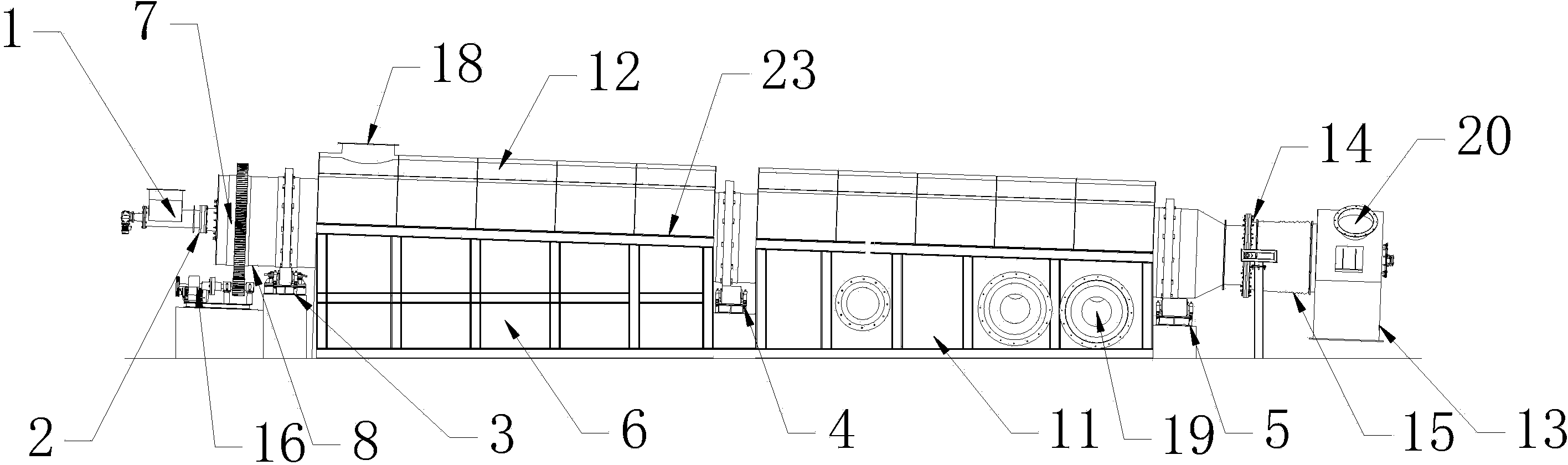 本發(fā)明解決其技術(shù)問題所采用的技術(shù)方案是:適用于污泥中溫下炭化處理的外熱式熱解 炭化爐,包括進(jìn)料裝置和筒體,所述筒體的兩端分別設(shè)有前托輪裝置和后托輪裝置,筒體中 部設(shè)有中托輪裝置,前托輪裝置與中托輪裝置之間的筒體外側(cè)設(shè)有前加熱室,中托輪裝置與 后托輪裝置之間的筒體外側(cè)設(shè)有后加熱室,后加熱室的外壁上設(shè)有熱煙氣進(jìn)口,前加熱室的 外壁上設(shè)有熱煙氣出口,熱煙氣進(jìn)口通過熱風(fēng)道與熱煙氣出口相通,所述筒體的進(jìn)料端設(shè)有 進(jìn)料裝置,進(jìn)料裝置與筒體之間設(shè)有前密封裝置,前密封裝置與筒體之間柔性連接,筒體的 進(jìn)料口處設(shè)有斜形導(dǎo)料板,筒體內(nèi)設(shè)有交錯布置的高低不同的抄板,抄板與筒體之間設(shè)有加 強(qiáng)筋板,靠近筒體進(jìn)料端的抄板的端部設(shè)有破碎裝置,筒體的后端設(shè)有出料罩,出料罩與筒 體之間設(shè)有后密封裝置,出料罩的頂部設(shè)有炭化氣出口。