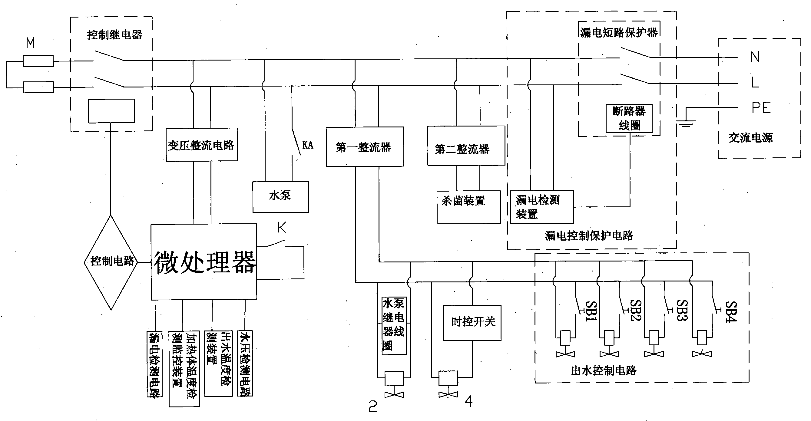 1.一種帶有時控開關的水處理凈化設備,包括前置保安過濾組件(1),前置保 安過濾組件(1)的一端通過進水電磁閥(2)與過濾膜組件(3)的一端連接, 過濾膜組件(3)的另一端分別與沖洗電磁閥(4)的一端、殺菌裝置(6)的一 端連接,殺菌裝置(6)的另一端與出水控制閥(8)連接,還包括電路結構,該 電路結構包括交流電源,交流電源分別與漏電控制保護電路、第一整流器、第二 整流器、變壓整流電路、控制繼電器、發熱體組(M)連接,第一整流器分別與 進水電磁閥(2)、沖洗電磁閥(4)、出水控制電路連接,變壓整流電路與微處理 器的一端連接,微處理器分別與啟動按鈕(K)、水壓檢測電路、漏電控制保護 電路、控制電路連接,控制電路與控制繼電器連接,其特征在于,所述的過濾膜 組件(3)與殺菌裝置(6)之間設有流量控制裝置(5),殺菌裝置(6)與出水 控制閥(8)之間設有加熱處理裝置(7),第二整流器與殺菌裝置(6)連接,所 述的沖洗電磁閥(4)與時控開關串聯。