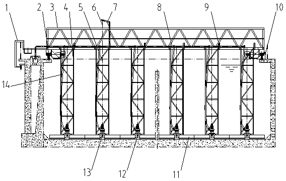 與現有技術相比,本實用新型在主梁上增設了一個用于起吊潛水泵的起吊裝置,通過該起吊裝置從而調整潛水泵距離池底的距離,從而避免吸泥機的阻塞。