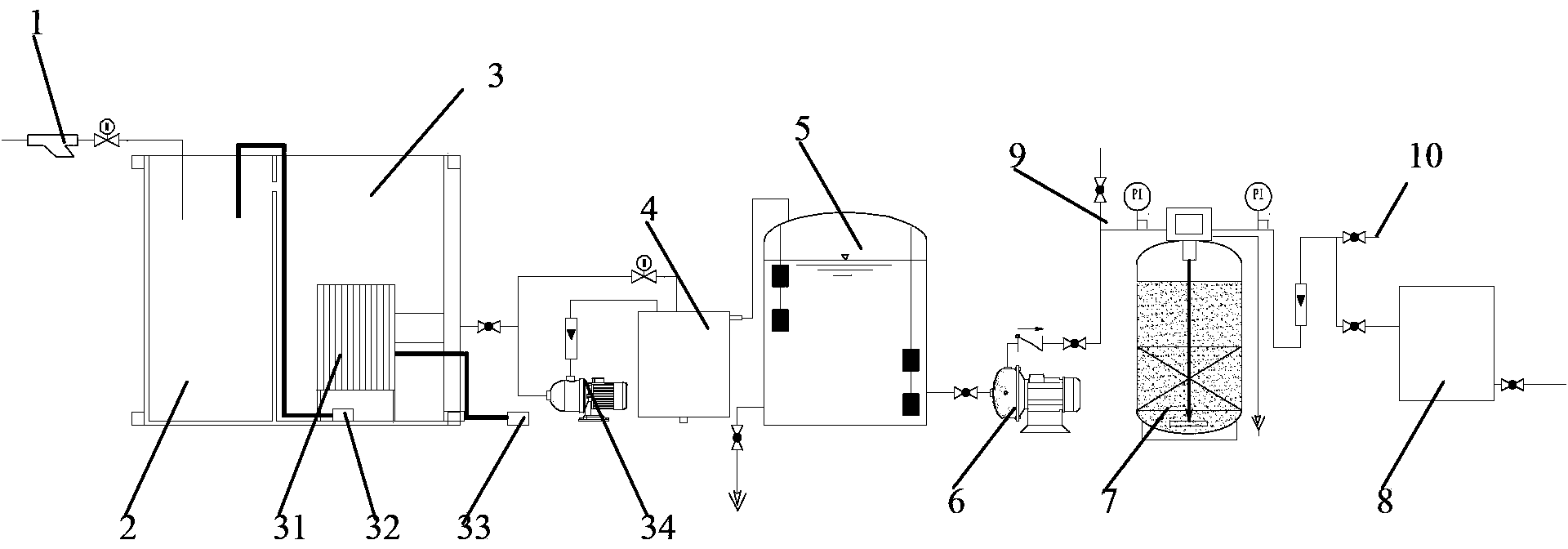 本實用新型的污水回用系統(tǒng),結(jié)合生物處理和過濾處理技術(shù),同時在各階 段實時進行水質(zhì)監(jiān)測,如果水質(zhì)達標(biāo)則直接排出進行回收利用,能有效避免不 必要的凈水步驟,提高各組件的使用壽命,有效保證出水率并減低了回用成本, 達到節(jié)能減排的效果。