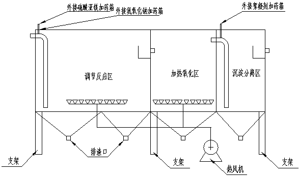 ——調節反應區:在調節反應區投加硫酸亞鐵,并加入NaOH對廢水pH進行調節,控制廢水pH值在6~9,同時通過熱風機加入高溫空氣進行攪拌和預加熱;