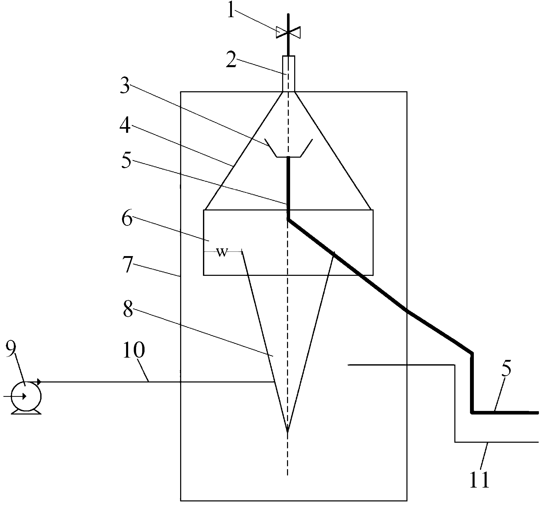 1.一種高含溶解氣污水處理裝置,其特征在于:包括污水輸送泵(9)、污水導(dǎo)流管(10)、氣壓平衡罐(7)、呼吸閥(1)、管狀排氣咀(2)、錐狀污泥集聚罐(4)、收泥槽(3)或收泥碗、出泥管(5)、圓錐狀旋流反應(yīng)罐(8)、呈圓柱管狀的環(huán)形圍堰壁(6)和出水管(11);在氣壓平衡罐(7)罐腔內(nèi),錐狀污泥集聚罐(4)固裝在圓錐狀旋流反應(yīng)罐(8)的上方,錐狀污泥集聚罐(4)具有的尖端豎直朝上且設(shè)置有僅連通錐狀污泥集聚罐(4)罐腔的管狀排氣咀(2),氣壓平衡罐(7)頂部罐壁設(shè)置有穿透壁體的通孔,管狀排氣咀(2)經(jīng)該通孔穿過(guò)氣壓平衡罐(7)頂部罐壁而伸出至氣壓平衡罐(7)頂面罐壁之外,管狀排氣咀(2)外周壁與通孔周邊相固接密封,在管狀排氣咀(2)伸出至氣壓平衡罐(7)頂面罐壁之外的管口上安裝著呼吸閥(1),圓錐狀旋流反應(yīng)罐(8)具有的被封閉尖端豎直朝下,圓錐狀旋流反應(yīng)罐(8)相應(yīng)僅有的圓形罐口位于其具有的尖端的上方且豎直朝上,在圓錐狀旋流反應(yīng)罐(8)周壁與氣壓平衡罐(7)周壁之間設(shè)置著環(huán)形圍堰壁(6),環(huán)形圍堰壁(6)與錐狀污泥集聚罐(4)僅有的圓形罐口邊沿相固接而環(huán)繞圓錐狀旋流反應(yīng)罐(8)僅有的圓形罐口,環(huán)形圍堰壁(6)與圓錐狀旋流反應(yīng)罐(8)環(huán)繞圓形罐口的周壁之間相應(yīng)留置有環(huán)繞圓錐狀旋流反應(yīng)罐(8)圓形罐口的圓環(huán)形間隙,環(huán)形圍堰壁(6)與氣壓平衡罐(7)周壁互不接觸以至環(huán)形圍堰壁(6)與氣壓平衡罐(7)周壁留置有圍繞環(huán)形圍堰壁(6)的環(huán)形間隙,在錐狀污泥集聚罐(4)罐腔內(nèi)固裝著收泥槽(3)或收泥碗,收泥槽(3)和收泥碗兩者之一與錐狀污泥集聚罐(4)周壁互不接觸以至在收泥槽(3)與錐狀污泥集聚罐(4)周壁之間或收泥碗與錐狀污泥集聚罐(4)周壁之間留置有間隙,在收泥槽(3)底部或收泥碗底部設(shè)置著穿透其底部壁體的漏泥孔,漏泥孔與出泥管(5)的一端管口相連接,出泥管(5)的另一端管口穿過(guò)氣壓平衡罐(7)罐壁而伸出至氣壓平衡罐(7)之外,氣壓平衡罐(7)其位于環(huán)形圍堰壁(6)下方的罐壁設(shè)置著穿透其壁體的出水孔,出水孔連通外置于氣壓平衡罐(7)之外的出水管(11);圓錐狀旋流反應(yīng)罐(8)靠近其尖端的罐壁設(shè)置有上穿透其壁體的污水進(jìn)孔,污水輸送泵(9)的出口通過(guò)穿過(guò)氣壓平衡罐(7)罐壁的污水導(dǎo)流管(10)連通污水進(jìn)孔;當(dāng)污水輸送泵(9)將污水依次經(jīng)污水導(dǎo)流管(10)和污水進(jìn)孔泵入圓錐狀旋流反應(yīng)罐(8)罐腔內(nèi)時(shí),經(jīng)污水進(jìn)孔被泵入圓錐狀旋流反應(yīng)罐(8)罐腔內(nèi)的污水受污水導(dǎo)流管(10)和污水進(jìn)孔約束而斜向上噴流,其噴流方向?yàn)閳A錐狀旋流反應(yīng)罐(8)軸向正投影所呈現(xiàn)的圓形切線方向;當(dāng)呼吸閥(1)開(kāi)啟時(shí),呼吸閥(1)敞開(kāi)管狀排氣咀(2)以至錐狀污泥集聚罐(4)罐腔依次通過(guò)管狀排氣咀(2)和呼吸閥(1)連通氣壓平衡罐(7)外部大氣,當(dāng)呼吸閥(1)閉合時(shí),呼吸閥(1)封堵管狀排氣咀(2)以至將氣壓平衡罐(7)罐腔與氣壓平衡罐(7)外部大氣封隔開(kāi)來(lái)。