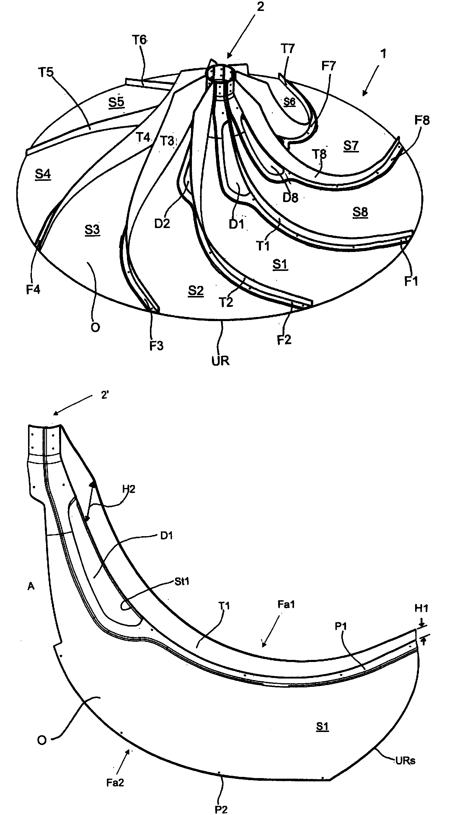 根據本發明的一個特別有利的實施方式,多個部段,優選全部部段分別具有從其圓周邊緣段向其連接部段延伸的傳輸肋。傳輸肋的高度優選從圓周邊緣段向缺口逐漸增加,并隨后向所述連接部段的方向再逐漸減少。傳輸肋在圓周邊緣段區域的最小高度和最大高度之間的比例例如在1:5至1:100之間,優選1:5至1:20。