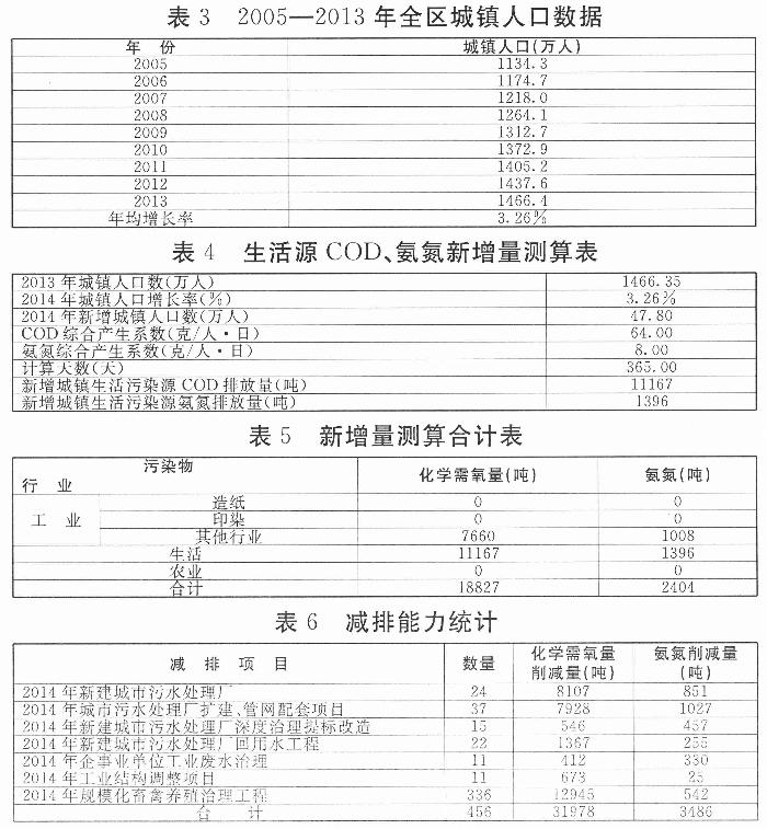 參照全區2005年至2013年城鎮人口數據,年均增長率為3.26%計算,按照COD、氨氮綜合產生系數64.8(克/人·日)計算,2014年新增城鎮生活COD、氨氮排放量分別為11167噸、1396噸。