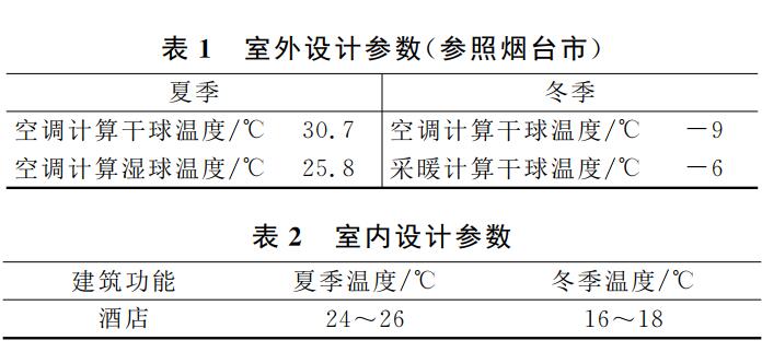 以煙臺市某酒店溫泉項目,建筑面積32000 m2,共6層,每層層高3.1 m。該建筑采用節能設計。按中華人民共和國國家標準《民用建筑節能設計標準》第4.1.2 條規定:屋頂和外墻應加強保溫,墻體保溫層采用100 mm 厚的聚苯板;建筑外墻傳熱系數為0.40 W/m2 ·℃;屋頂采用 120 mm 厚 聚 苯 板;屋 面 傳 熱 系 數 為 0.36W/m2·℃;確保門窗氣密性良好,其氣密性等級不低于現行國家標準《建筑外窗氣密性能分級及檢測方法》4級水平;外墻周邊地面墊層下鋪100 mm 厚的聚苯板,建筑地面傳熱系數為0.3 W/m2·℃。