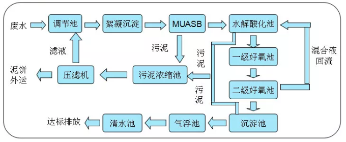 廢水經污水收集管網進入調節池,主要是為了均化水質水量,減少對系統的沖擊。絮凝沉淀系統可以去除廢水中的懸浮物,降低后續系統的負荷。UASB反應器能高效的去除廢水中的COD,出水自流至水解酸化池,可將大分子有機物分解成小分子有機物,提高了好氧生化的處理能力,同時可有效地進行脫氮除磷。工藝設置有兩級好氧池,好氧池內的好氧微生物可以利用廢水中的有機物進行新陳代謝,降低廢水中的有機物的含量,微生物絮體在沉淀池進行重力沉降,下沉污泥進入污泥濃縮池,上層清液進入氣浮池,出水進入清水池,可達標排放。