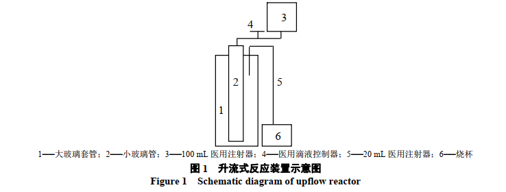 燒杯實驗采用3個500mL燒杯和2個100mL量筒。氫氧化鉻污泥和焦銅廢水混合后的總體積為500mL。污泥使用前充分攪拌均勻。將污泥從量筒中傾倒出來后,用另一量筒量取焦銅廢水多次清洗并倒入相應的燒杯中,防止量筒內殘留污泥。使用玻璃管、醫用注射器、鐵架臺等組裝簡易的升流式反應器。將小玻璃管(內徑6mm,高1000mm)固定放置于大玻璃柱(內徑30mm,高800mm)的中心,組成升流式反應器。100mL醫用注射器及滴液控制器共同控制焦銅廢水流速,20mL醫用注射器用于液體移出。