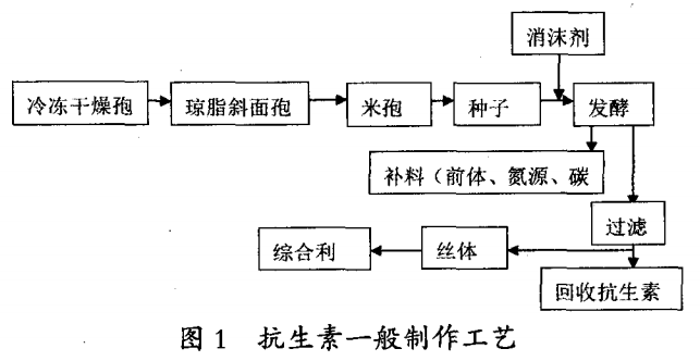 抗生素常見于日常生活中,可以有效幫助人類治愈疾病。20世紀2O年代末,它開始進入人們的視線,現在種類繁多。近年來,抗生素在醫院被廣泛使用,在臨床醫藥上扮演著越來越重要的角色。但是,抗生素會帶來環境危害,人們需要探尋相應的方法來加以解決。.抗生素通常采用發酵法制作工藝,其一般制作工藝流程如圖1所示。