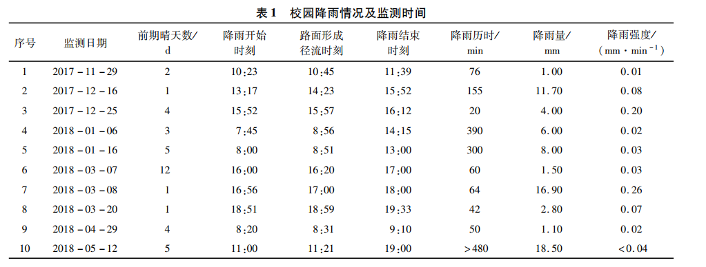 1.1取樣與監(jiān)測以江蘇大學圖書館前路面篦子處為采樣點,對10場不同降雨進行分析研究。降雨在路面形成徑流后采集并計時。依據(jù)降雨強度,每隔一定時間采樣一次,記錄每次采樣時間。初期取樣時間間隔短,隨著降雨歷時逐漸增加。表1列出了降雨監(jiān)測信息。