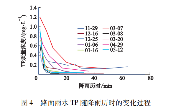圖4為路面雨水TP隨降雨歷時的變化關(guān)系。由圖可見形成徑流的0~10min內(nèi),TP質(zhì)量濃度急劇下降,之后基本穩(wěn)定。對比發(fā)現(xiàn),3月7日的TP變化曲線高于3月8日,是因為3月7日距上一次降雨長達12d,所以開始降雨時,TP質(zhì)量濃度高達1.20mg·L-1,經(jīng)輕微沖刷后,3月8日TP質(zhì)量濃度明顯降低。