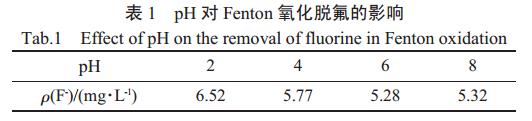 由圖1和表1可以看出,當pH為4時,COD的去除效果明顯高于pH為2、6、8的情況,而脫氟性能則隨溶液的酸性增加而增加。溶液酸性過高,一方面不利于脫氟,另一方面容易腐蝕相關設備。