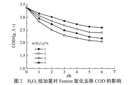 由圖2和表2可以看出,當H2O2的投加量為3%時,COD的去除效果明顯高于H2O2的投加量為1%、2%、4%的情況。H2O2的適宜投加量為3%。