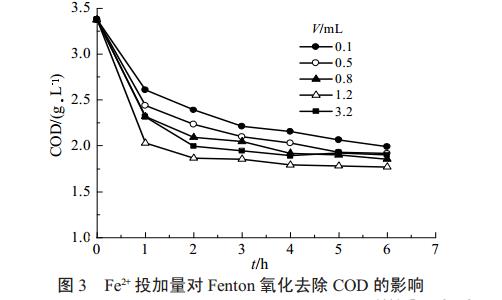 在反應體系中,Fe2+的投加量較小時,COD的去除效果會隨Fe2+的投加量的增加而增加,而Fe2+的投加量為3.2mL時,COD的去除效果卻變差。原因是Fe2+的投加量過高時,過量的Fe2+會與•OH反應生成Fe3+和OH-,繼而沉淀,既影響H2O2的催化分解產生•OH,又消耗了部分•OH,影響COD的去除。不同Fe2+投加量條件下F-產生情況與COD去除情況相類似,表明脫氟性能隨著Fe2+的增加會出現拐點,并不是單純的正效應。綜合以上結論,對于該氟化工廢水采用Fenton氧化工藝作為預處理工藝時,選擇1.2mL(114mmol/L)Fe2+投加量為宜。