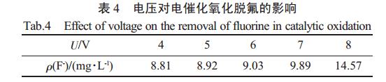 每100mL原水,調節pH為7,采用石墨電極,改變電壓,得到電壓對電催化氧化工藝COD去除性能以及脫氟性能的影響,如圖4和表4所示。