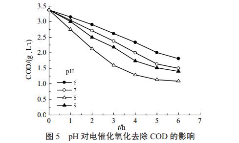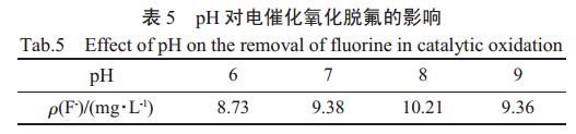 每100mL原水,采用石墨電極,固定電壓7V,改變pH,得到pH對電催化氧化工藝COD去除性能以及脫氟性能的影響,如圖5和表5所示。