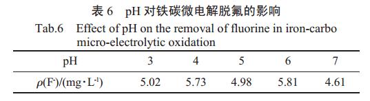 由圖6和表6可以看出,pH為4左右時,COD的去除效果和除氟性能要優于pH為3、5、6、7的情況,由此確定最佳pH為4左右。