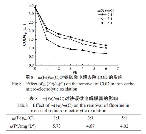 取100mL原水,固定pH為4、液固質量比為5:1,改變鐵碳質量比,得m(Fe)/m(C)對鐵碳微電解COD去除性能以及脫氟性能的影響,如圖8和表8所示。