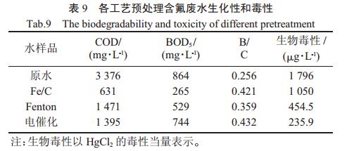 取各工藝以適宜條件進行反應6h,測定COD、BOD5及生物毒性,比較經各工藝預處理后含氟廢水的可生化性和生物毒性,得表9。