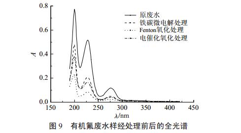 由圖9可以看出,經過各種氧化工藝處理以后,水樣中特征吸收峰高度都顯著下降,由此可以判斷該含氟廢水中存在某種或某幾種含量相對較高的主要的含氟有機污染物質,在各種氧化工藝的作用下,這部分有機氟污染物被一定程度去除。其中Fenton氧化處理相對于鐵碳微電解處理、電催化氧化處理,對于有機氟污染物的去除效果較為顯著。結合表8可以認為對于有機氟廢水的預處理,Fenton氧化、電催化氧化、鐵碳微電解在不同的指標下各占優勢。