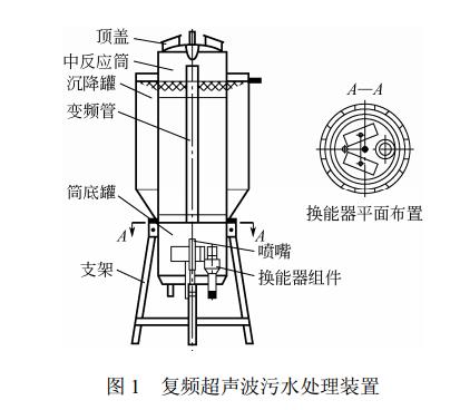 自制復頻超聲波污水處理裝置(圖1)為一臺污水處理的中試機,工作原理如圖2所示:污水從射流噴嘴噴出,在變頻管中受超聲作用,噴出的污水撞擊圓錐體導流罩被霧化,液體回落后在反應器內繼續受到超聲波空化作用,變頻管底部射流形成負壓使液體反復循環,經反復處理的污水上清液由出水口流出,沉淀部分在沉降罐沉淀。該實驗中處理的是土霉素模擬廢水,沒有沉淀產生,故經筒底罐的換能器組件直接作用,處理體積為40L。
