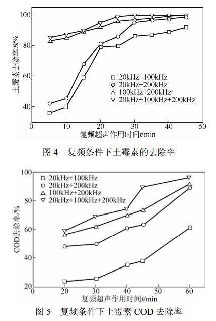 (3)復頻超聲在20kHz、100kHz、200kHz這3種頻率不同組合的復頻超聲作用下,探究土霉素去除率和COD去除率變化情況。