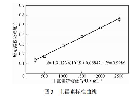 (1)土霉素標準溶液配制稱取土霉素對照品26.2mg放到小燒杯中,加入0.1mol/L的鹽酸溶液4.0mL,使之全溶,轉移至50mL容量瓶中,加0.01mol/L的鹽酸溶液定容,使之成為效價500.0U/mL的標準溶液。