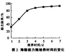 采用煉油廢水生化污泥經(jīng)過近1個(gè)月的培養(yǎng),發(fā)現(xiàn)載體上生長(zhǎng)了大量的微生物(以淺色疏松的絲狀菌為主),廢水中COD有一定的降解(降解量為40—80mg/L),但是,廢水中的酚基本上沒有得到降解(降解量?jī)H為2—8mg/L)。這說明,在高濃度酚的存在下,生化污泥中的細(xì)菌受到了抑制,缺乏耐酚型微生物。 改用生活污泥進(jìn)行微生物培養(yǎng),結(jié)果發(fā)現(xiàn),生活污泥中的微生物種類較多,大量的不同類型的微生物為降酚菌的培養(yǎng)提供了菌源;培養(yǎng)效果可從圖2反應(yīng)出來。 結(jié)果顯示,在3-4d的時(shí)間,由生活污泥培養(yǎng)出的生物膜即可達(dá)到很強(qiáng)的降酚能力,酚去除率已接近90%;同時(shí)鏡檢發(fā)現(xiàn):生物膜中的菌膠團(tuán)結(jié)構(gòu)良好,其中含大量的球菌、雙球菌、鏈球菌。 2 結(jié)果與問題討論 2.1 主要污染物的降解